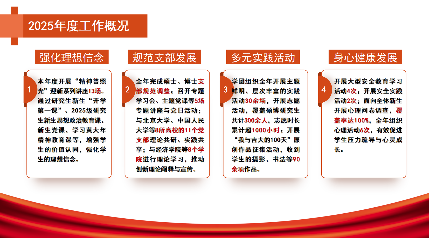 在2025年成功举办毕业典礼等多项品牌活动,“精神普照光”系列影响力持续增强,整体工作体系健全、成效显著,为后续工作夯实基础。