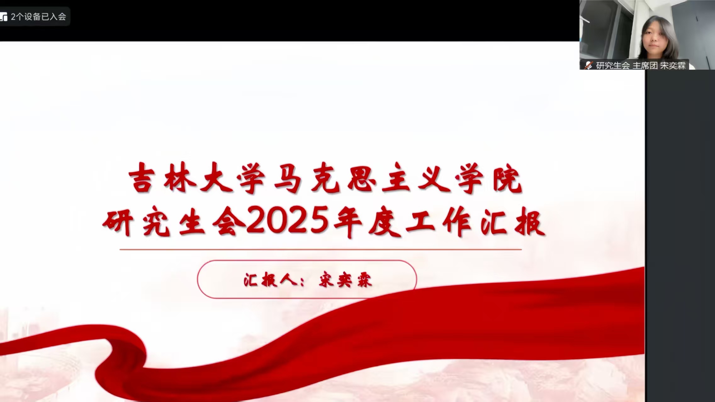 其次,研究生会主席宋奕霖进行工作汇报。本年度,研究生会围绕组织建设、活动育人与服务协同三方面开展工作:顺利完成换届选举,吸纳新生力量,激发组织活力;开展南湖公园环保实践、长春建筑馆参观学习、端午节包粽子等特色活动;在迎新晚会中积极承担多项保障工作。立足现有基础,研究生会将围绕学校80周年校庆,深化与校内外相关学生组织的联动,计划开展系列交流学习与主题献礼活动,进一步强化学科思想引领,凝聚爱校荣校共识。