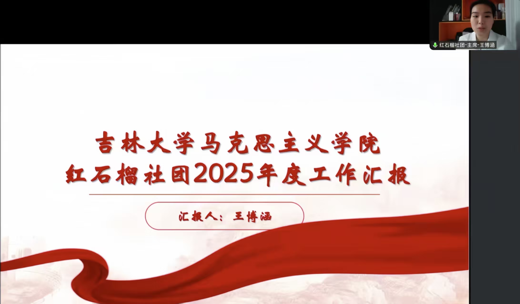 最后,红石榴社团主席王博涵进行工作汇报。本年度,社团顺利完成换届,重点推进内部融合与定位梳理,通过举办新成员见面会、民族联谊、篮球比赛等活动,初步奠定了组织发展的基础。新的一年,社团将重点围绕三方面展开工作:一是深化理论学习传播,通过沙龙、情景剧等形式推动马克思主义民族理论内化外化;二是打造“红石榴”特色品牌活动,结合校庆等重要节点开展融合性实践活动;三是加强内部建设,完善工作机制与培训体系,营造团队成长氛围。