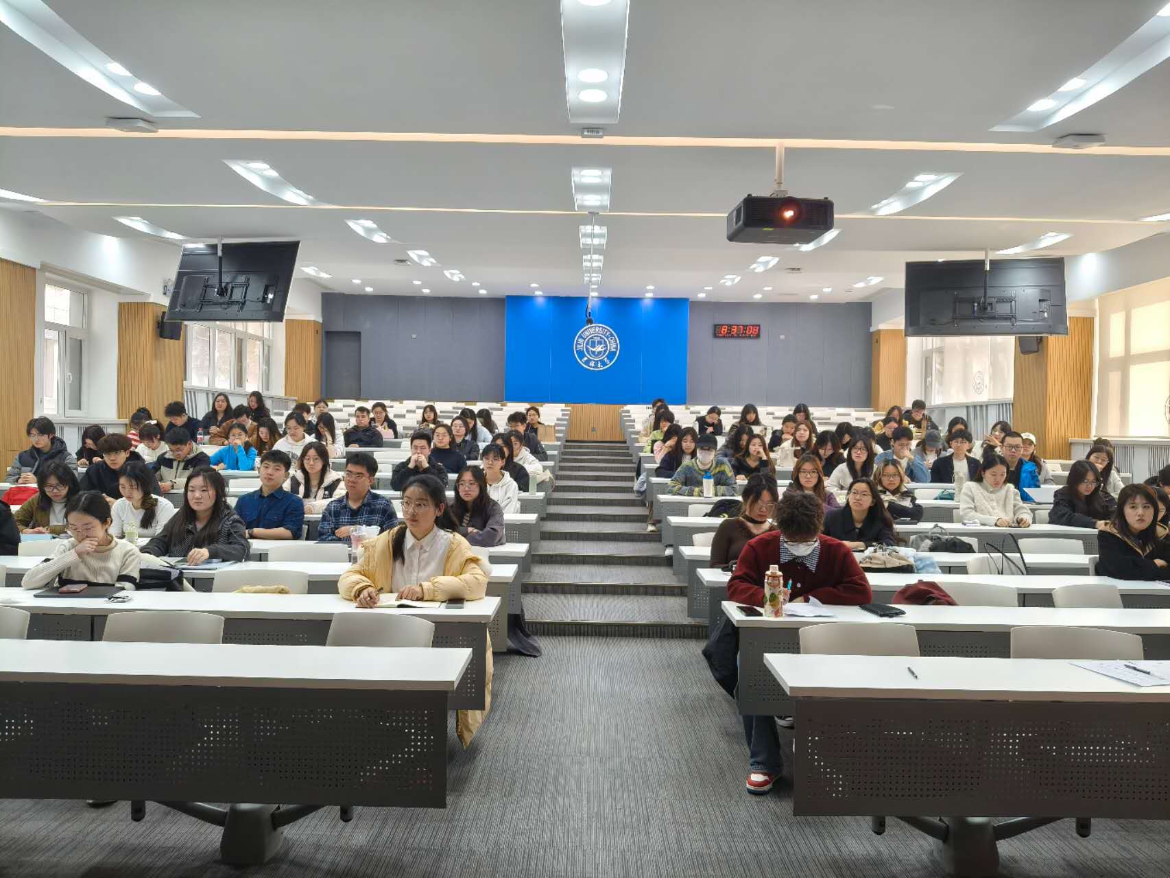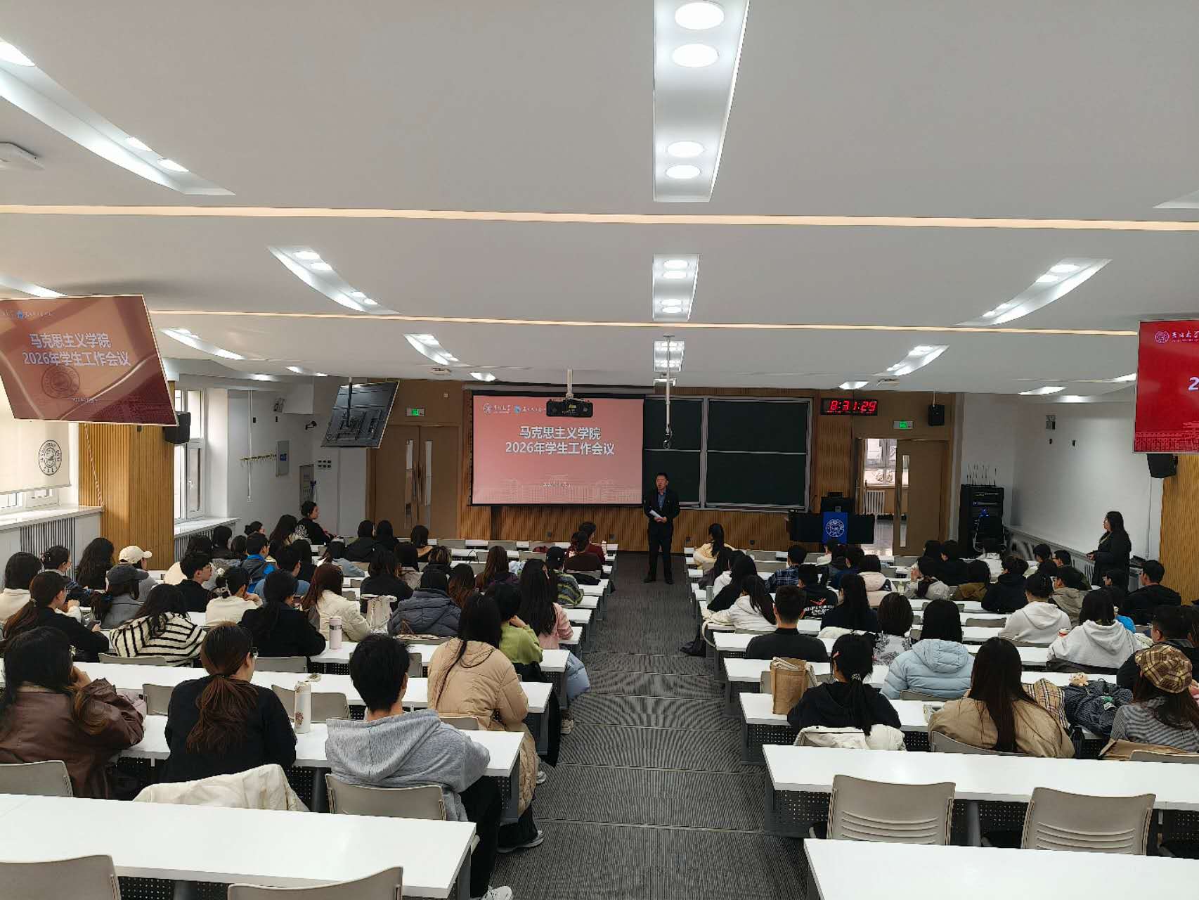 在中心校区逸夫楼第二阶梯教室召开学生工作会议。院党委副书记兼副院长、纪委书记金光旭主持会议,院团委书记、研究生辅导员万佳悦,学生工作办公室主任程思阳,2025级本科生辅导员于歆照,以及团学组织主要成员、学生党员参加会议。