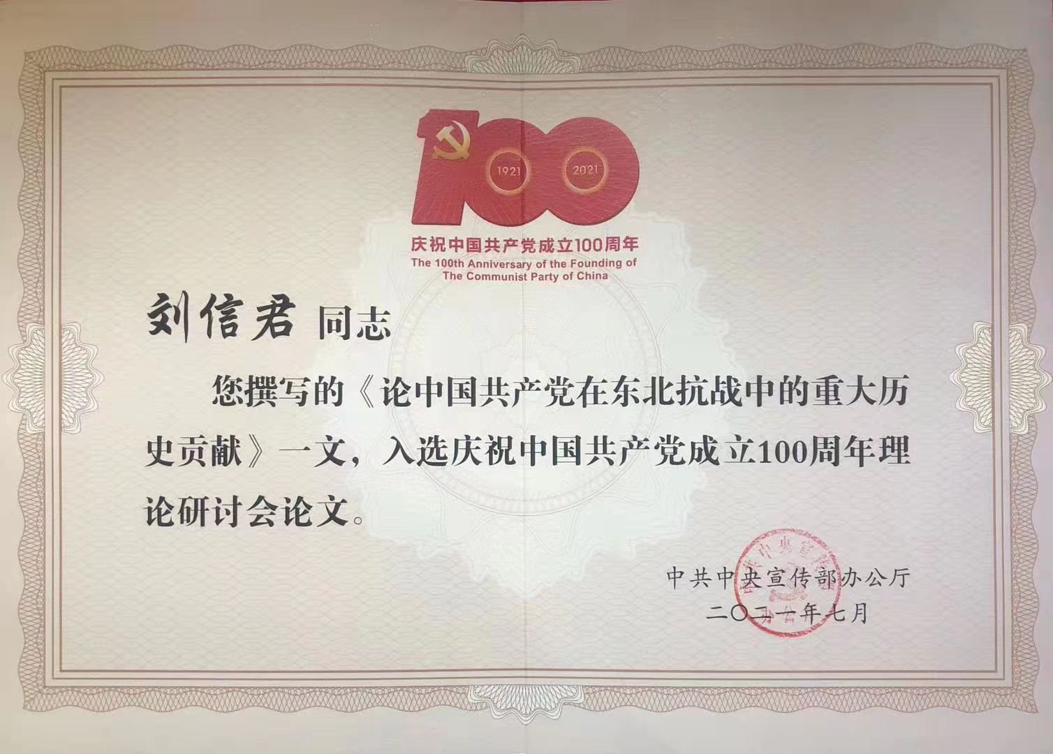 刘信君教授提交的论文《论中国共产党在东北抗战中的重大历史贡献》认为:中国共产党在东北抗战中作出了三大历史贡献,一是确立了东北抗战的指导思想,率先贯彻与实践抗日民族统一战线方针,全国抗日民族统一战线的形成提供了借鉴;二是组建了东北抗日武装,最早建立了抗日游击根据地,率先开展了抗日游击战争,沉重打击了日本帝国主义,有力配合了全国抗战;三是中国共产党领导的东北抗日武装与朝鲜共产主义者、苏联远东军密切配合,共同作战,是国际合作抗战的典范,为世界反法西斯战争的胜利做出了贡献。