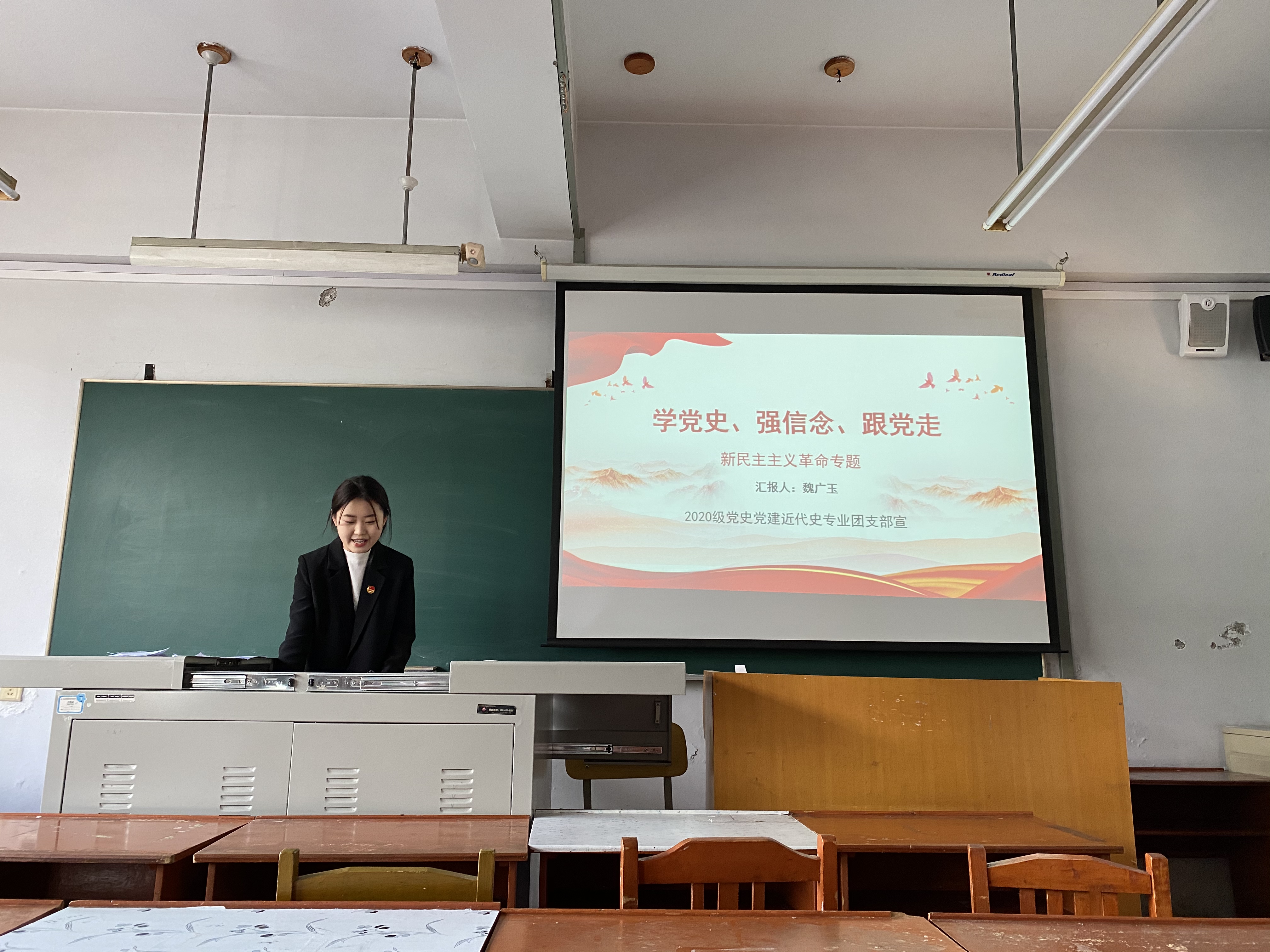 首先,魏广玉就新民主主义革命时期的历程进行梳理,详细论述了中国共产党为什么“能”。随后,大家观摩学习了新民主主义革命时期的影像,一帧帧画面的流淌是中国共产党人和无数仁人志士用流血和牺牲为新中国奋斗的缩影。最后,与会同学就新民主主义革命时期的研究和学习做了热烈的分享与交流,同学们纷纷表示将从党史的学习中汲取前行的力量,本次学习会取得了圆满成功。
