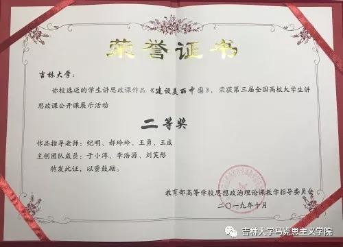 于小淳、李浩源、刘芙彤团队在纪明、郝玲玲、王勇、王成老师指导下,荣获“砥砺前行七十载奋斗成就中国梦”——第三届全国大学生讲思政课公开课展示活动决赛二等奖。