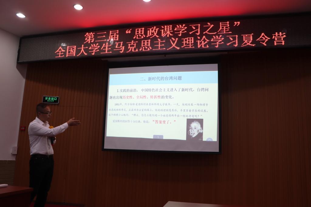 张岩副教授、里光年副教授运用“智慧课堂”的理念,采用新媒体教学的全新形式,分别为大家带来题为《反抗外来侵略的斗争》和《台湾问题的新时代特征》的主题授课。张老师从“反侵略斗争失败的原因”和“民族意识的觉醒”两个方面展开,运用学生微课堂展示、现场投票、现场问卷等方式,为同学们带来了一堂生动活泼的思政课。里光年老师从“台湾问题的涵义”、“新时代的台湾问题”和“台湾问题的新时代特征”三个角度深度剖析了台湾问题产生的时代背景、进入新时代后台湾问题发生的一系列变化,展望了未来祖国统一大业必将实现的前景。两位老师在给营员们授课的过程中,以学习通APP为载体,将授课内容贯穿线上线下,采用老师讲授和学生讲授相结合的教学方式,加强了师生之间的交流互动,提高了学生们“抬头率”,让大家收获了一场生动有趣的智慧思政课体验。
