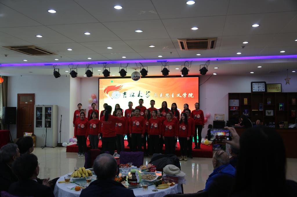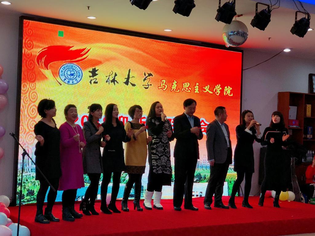 行政人员亲如一家的深厚情感;概论教研室的大合唱《团结就是力量》刚劲有力,表现出马院教师团结一致迎接美好明天的决心;原理教研室杨洪兴老师在联欢会上为大家带来原创诗歌朗诵《新时代的英雄》,文采飞扬、情真意切。此外,形势与政策教研室、研究生教研室分别带来原创三句半,诙谐幽默,引得大家叫好声不断。退休教师庞雅莉和邓如辛也分别带来《彩绸舞》和笛子独奏《大海航行靠舵手》。在丰富多彩的节目中,还穿插着抽奖环节和游戏环节,大家笑声不停,掌声不断,场面非常热烈。最终,联欢会在纲要教研室的大歌唱《歌唱祖国》中落下帷幕。